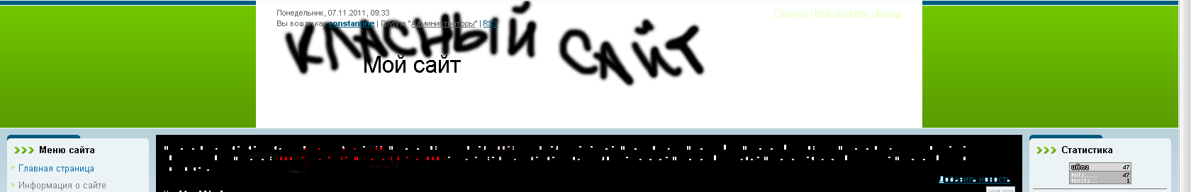 Code <div class="user-bar"><?if($USER_LOGGED_IN$)?><!--<s5200>-->Вы вошли как<!--</s>--> <a href="$PERSONAL_PAGE_LINK$"><b>$USERNAME$</b></a> | <!--<s3167>-->Группа<!--</s>--> "<u>$USER_GROUP$</u>"<?else?><!--<s5212>-->Приветствую Вас<!--</s>--> <b>$USERNAME$</b><?endif?> <?if($RSS_LINK$)?>| <a href="$RSS_LINK$">RSS</a><?endif?></div> <h1><!-- <logo> -->Мой сайт<!-- </logo> --></h1> <div class="navigation"><a href="$HOME_PAGE_LINK$"><!--<s5176>-->Главная<!--</s>--></a> | <?if($USER_LOGGED_IN$)?><a href="$PERSONAL_PAGE_LINK$"><!--<s5214>-->Мой профиль<!--</s>--></a><?else?> <a href="$REGISTER_LINK$"><!--<s3089>-->Регистрация<!--</s>--></a><?endif?> | <?if($USER_LOGGED_IN$)?> <a href="$LOGOUT_LINK$"><!--<s5164>-->Выход<!--</s>--></a><?else?> <a href="$LOGIN_LINK$"><!--<s3087>-->Вход<!--</s>--></a><?endif?></div> можешь это убрать если хочешь поставить лого. Code ('http://onlinekins.ucoz.com/Untitled-1.jpg') сюда вставь бг. |