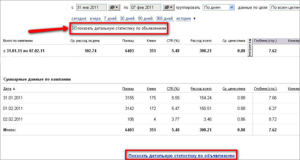 Чтобы получить детальные данные, нужно отметить пункт «показать детальную статистику по объявлениям».