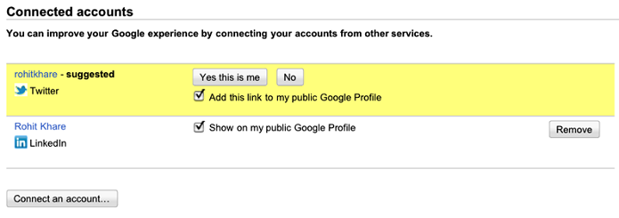 В связи с выше сказанным, Google несколько доработал процедуру связывания аккаунтов. Раньше эта возможность в Google profile была публичной, теперь вы можете привязывать аккаунты в приватной обстановке через Google Account. Также Google намерен и самостоятельно работать над «связыванием». Например, если поисковик найдет в социальных сетях ваш аккаунт, определив его по ФИО или другим данным, вам будет предложено связать его с SERP.